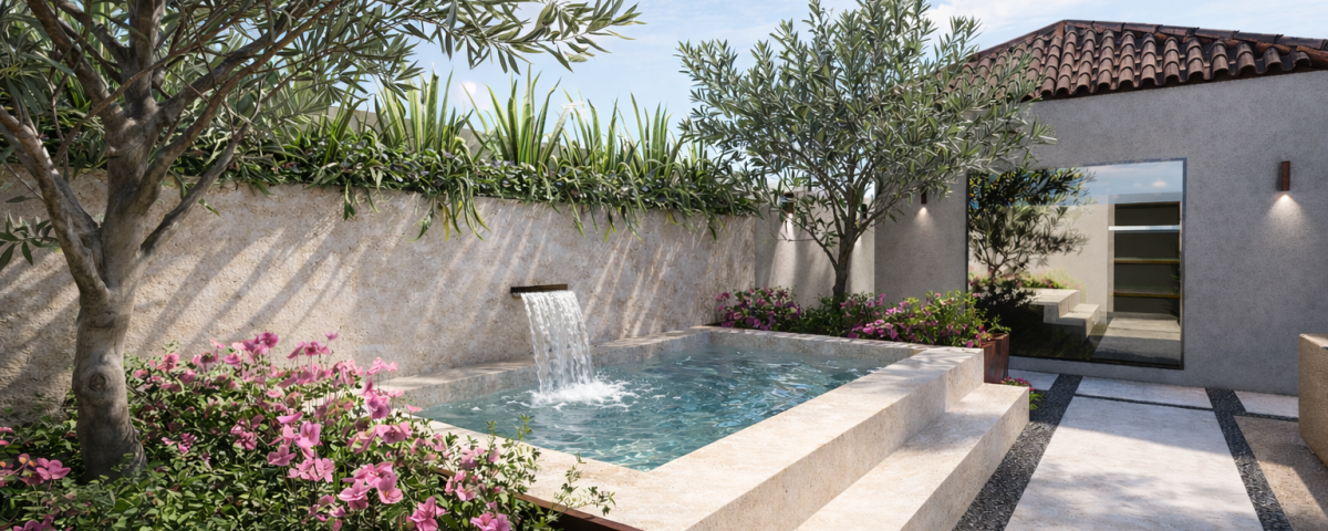 La intervención parte de un concepto claro: crear continuidad entre arquitectura, paisaje e interiorismo. Diseñamos un jardín de inspiración mediterránea donde la vegetación estructural, las especies aromáticas y la floración aportan textura, color y ritmo al conjunto. La lámina de agua se convierte en el eje central del proyecto, generando una atmósfera sensorial que potencia la experiencia del espacio exterior.