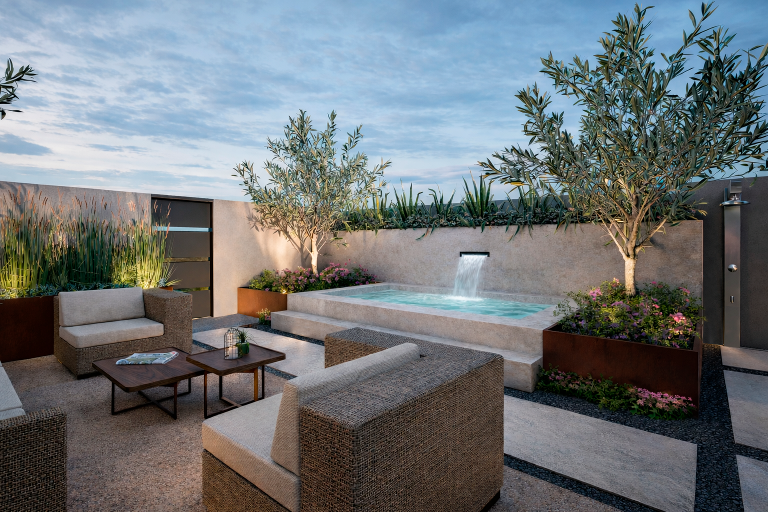 La terraza se concibe como una estancia más de la vivienda. La selección de materiales pétreos, acabados naturales y una iluminación arquitectónica cuidadosamente estudiada refuerzan la coherencia estética y funcional del conjunto. Cada elemento ha sido pensado desde una mirada global de interiorismo, buscando equilibrio, serenidad y atemporalidad.