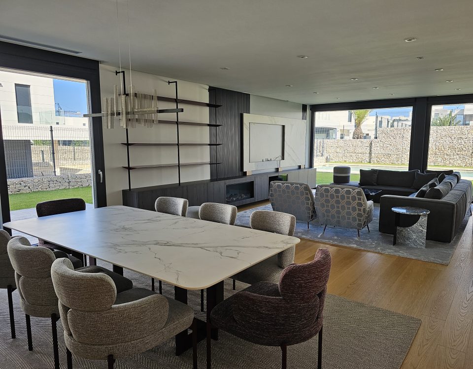 La conexión entre interior y exterior es una de las claves del proyecto, logrando una transición fluida entre los espacios a través de grandes ventanales y el uso de materiales en sintonía con la naturaleza. La terraza, diseñada como un oasis de relajación, combina mobiliario contemporáneo con zonas verdes que aportan frescura y dinamismo al conjunto. La disposición del mobiliario fomenta el uso versátil del espacio, permitiendo su disfrute tanto para momentos de descanso como para reuniones al aire libre.